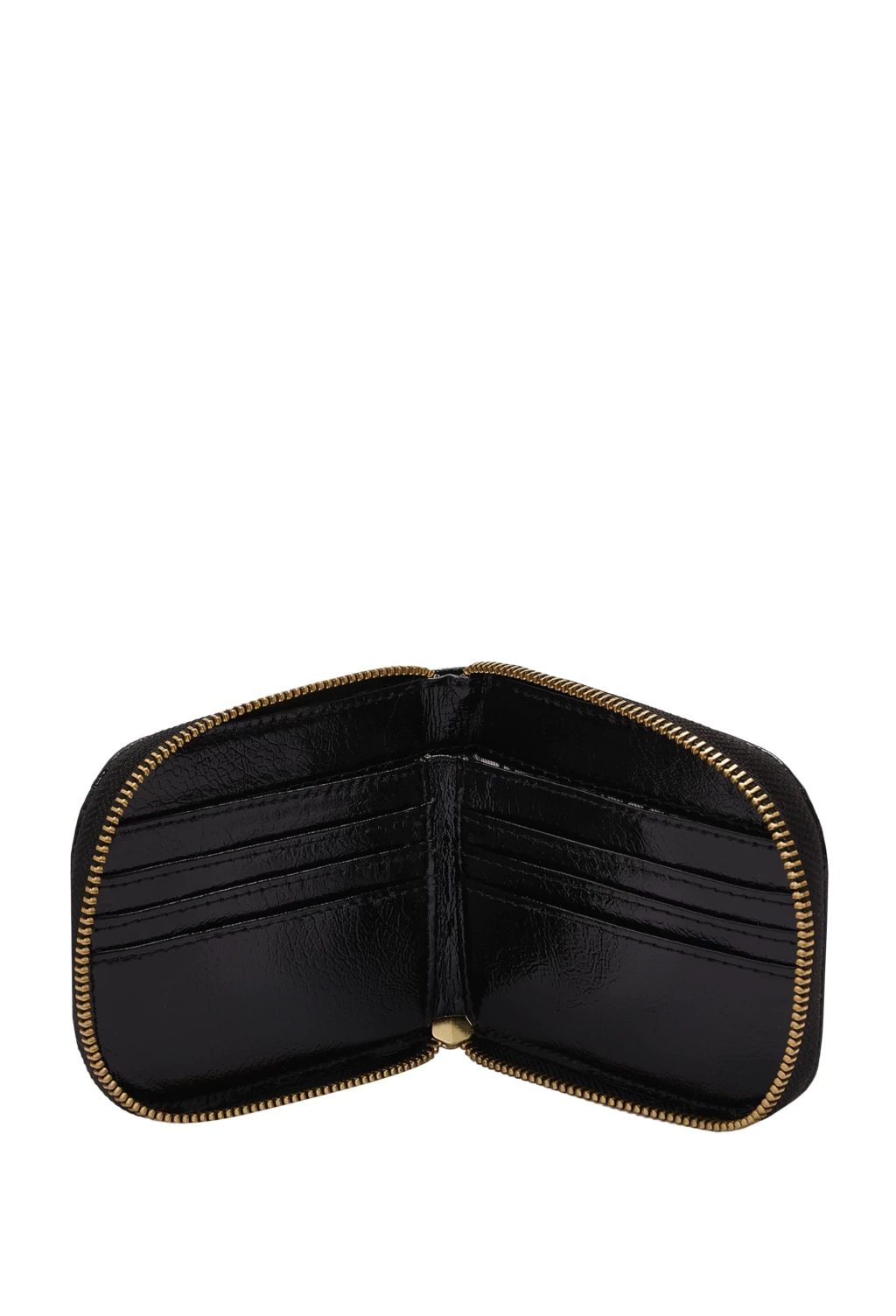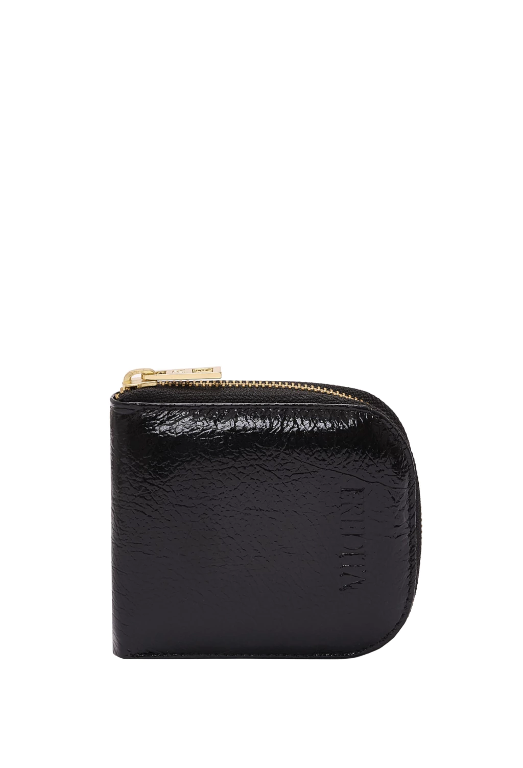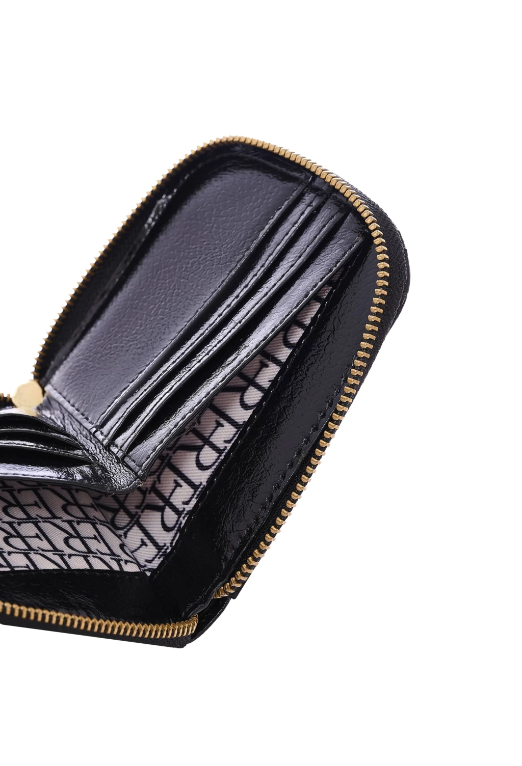 Billetera de tamaño mediano, con cierre dorado YKK y tira cierre ER. Confeccionada en cuero charol quebrado color negro, interior de cuero misma tonalidad y detalles en gabardina personalizada de la marca. Cuenta con espacio para seis tarjetas y dos compartimientos para billetes.