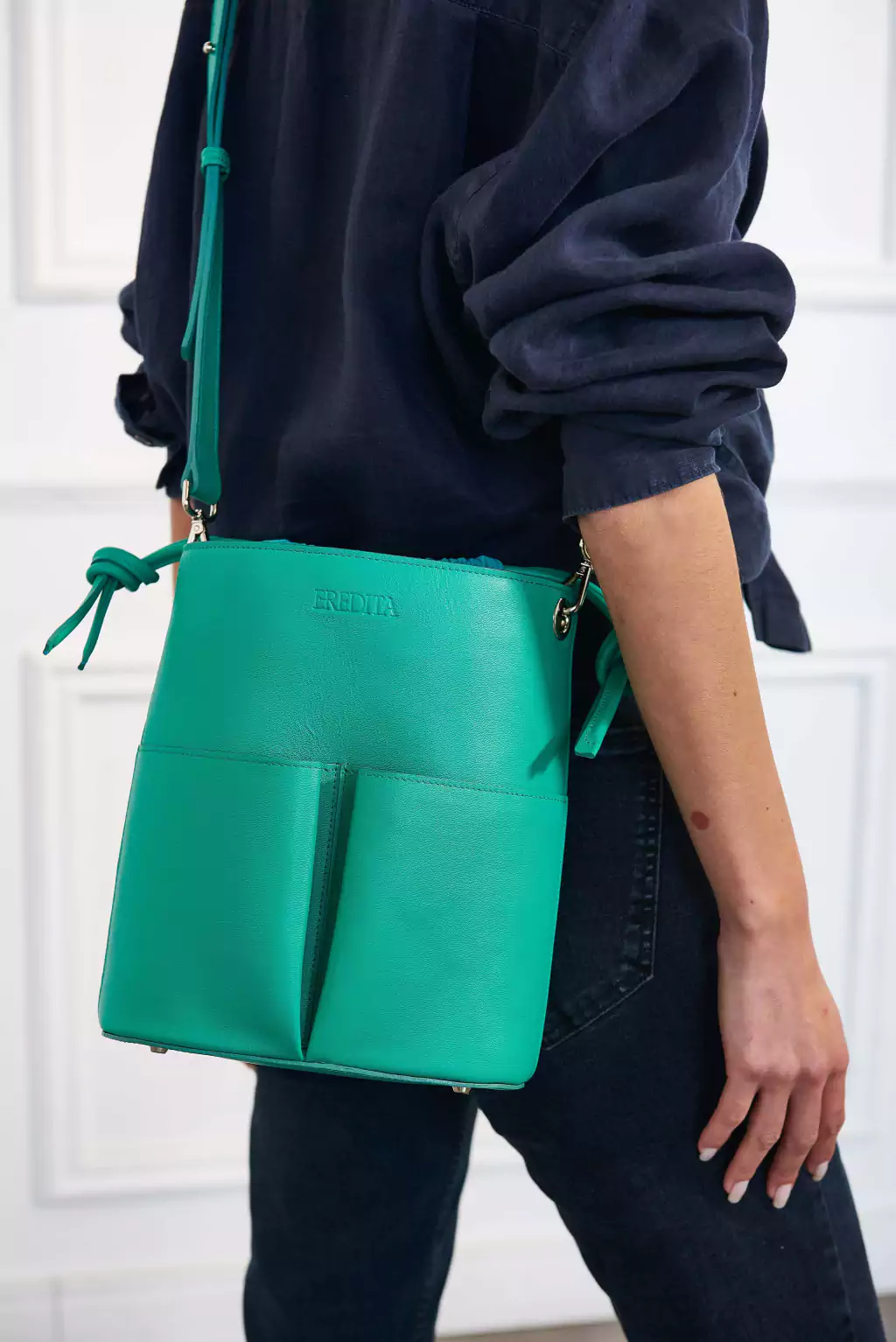 Bandolera de cuero vacuno con interior gamuzado. Bolsillo interno con cierre. Herrajes en níquel.